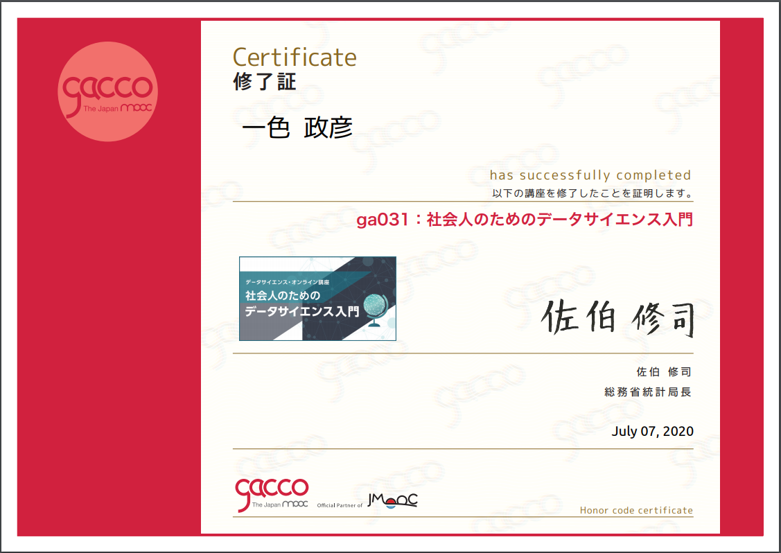『ga031:社会人のためのデータサイエンス入門』の修了証(2020)